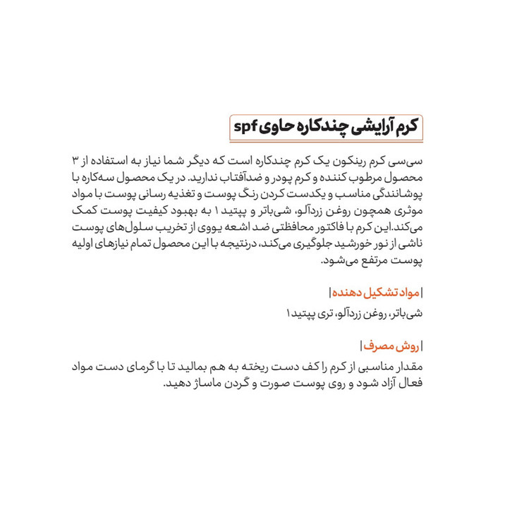 این محصول رینکون یک کرم چند کاره برای حفظ سلامت پوست صورت است که دیگر شما نیاز به استفاده از 3 محصول مرطوب کننده و کرم پودر و ضد آفتاب ندارید.سی سی کرم رینکون یک کرم آرایشی مرطوب کننده و ضد چروک و لیفتینگ پوست با قابلیت محافظت از پوست در برابر اشعه های مضر خورشید است.سی سی کرم رنگی رینکون حاوی درجه محافظت در برابر آفتاب برابر با SPF50 است که می تواند از پوست در برابر اثرات مخرب اشعه های خورشید محافظت کند. همچنین خاصیت رنگی بودن کرم سی سی رینکون می تواند کاستی های پوست را پوشش داده و به صورت یک پوشاننده عمل کند.